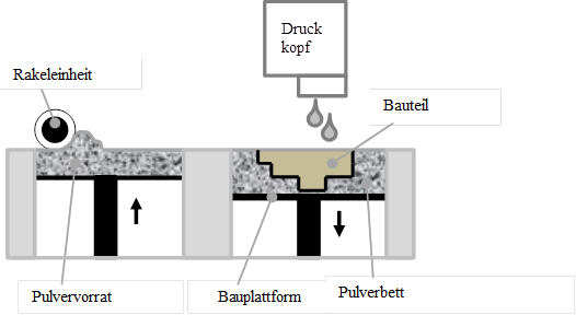 Bei pulverbasierten Verfahren werden Pulverschichten, Schichtdicke typisch zwischen 30 und 100µm, mittels einer Rakeleinheit aufeinander gestrichen. In jeder dieser Schichten werden mittels lokalem Aufbringens eines Binders oder mittels lokalem Schmelzen durch einen Laserstrahl die Pulverpartikel verbunden. Im Wesentlichen setzt sich der Prozess aus drei Prozessschritten zusammen: (I) Auftragen des Pulvers zu einer dünnen homogenen Schicht definierter Dicke, (II) Schreiben der Schichtinformation des computeranimierten und in Schichten zerlegten Modells in die obere Pulverlage mittels Bindereintrag oder Laserstrahlung und schließlich nach mehrmaliger konsekutiver Wiederholung beider Schritte, (III) Herauslösen des aufgebauten Bauteils aus dem unbehandelten losen Pulver, welches das Bauteil umgibt, dem Pulverbett [1-6].